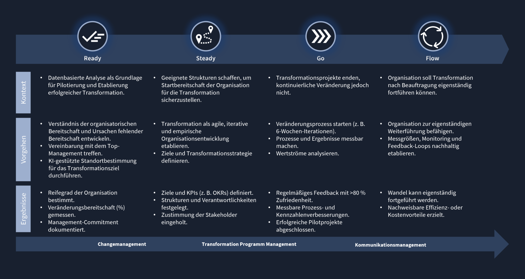 Der Prozess gliedert sich in die Phasen Ready, Steady, Go und Flow. Von der datenbasierten Vorbereitung über kurze Umsetzungsiterationen mit Echtzeit-Feedback bis hin zur Befähigung Ihrer Organisation für eigenständigen Wandel. Ziel ist, Ihre Teams so zu stärken, dass Transformation dauerhaft gelingt.